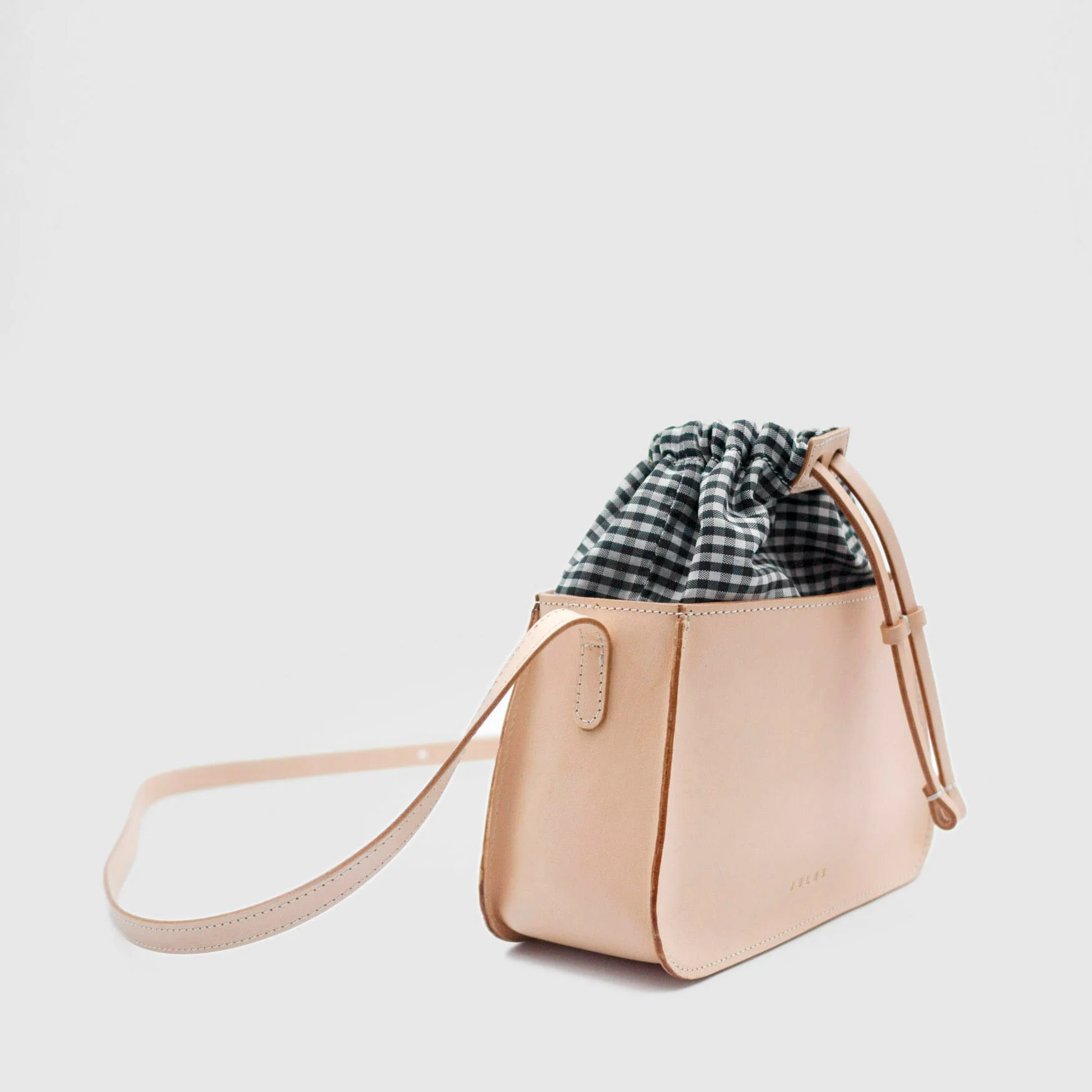 The Pyramid bucket bag is a tribute to our cherished Treasure bag, featuring a similar trapezoid leather body that’s both functional and visually striking. The bag’s triangular shape not only enhances its storage capacity but also makes it a standout accessory. The fabric upper secures with a cinched drawstring and a leather stopper, opening to a lined interior that includes a convenient cellphone pocket. Designed for versatility, it can be worn over the shoulder or crossbody using the adjustable shoulder strap.